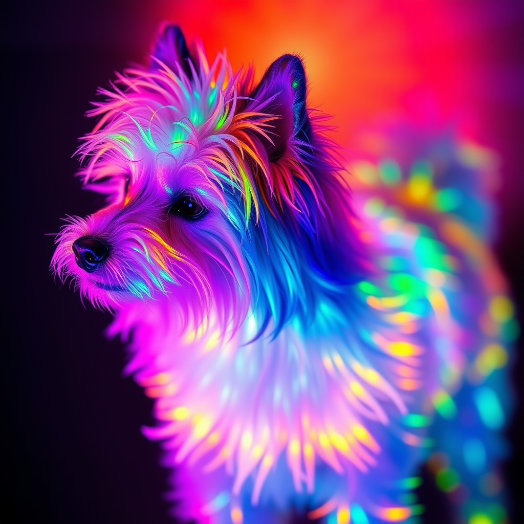 Luminous canine under ultraviolet glow, its fur shimmering in vibrant neon hues as it dances through a kaleidoscope of colors.