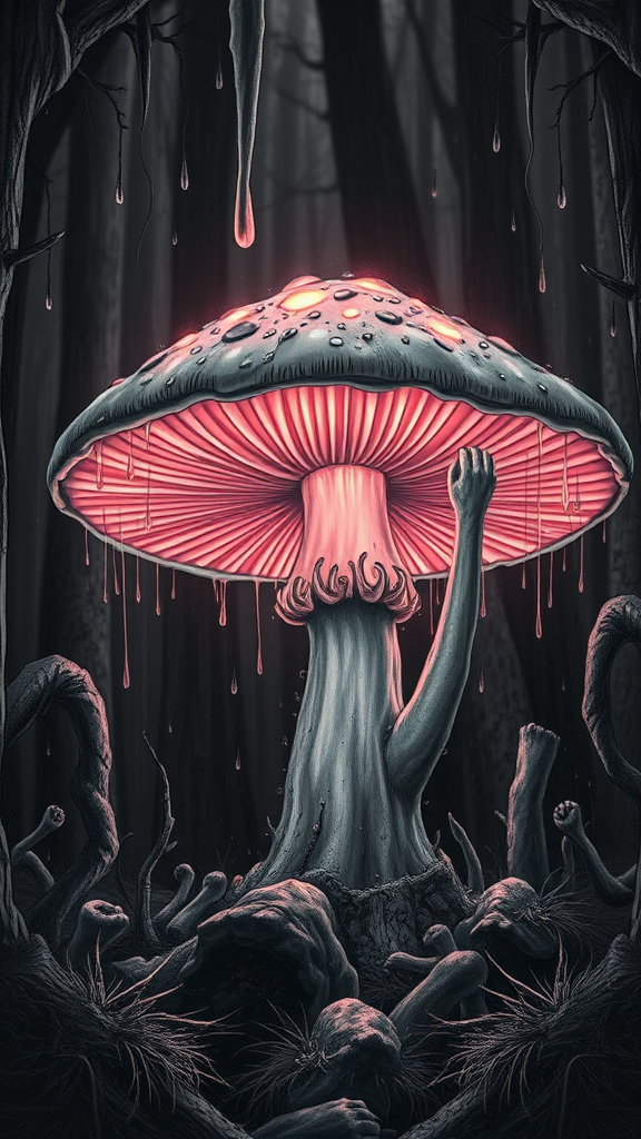 luminous glowing forest mushroom with neon lights, surrounded by drops of moisture, a hyperdetailed black and white scene with faded elements, featuring a surreal composition with poorly drawn anatomy, extra and missing limbs, and floating limbs subtly incorporated into the environment.