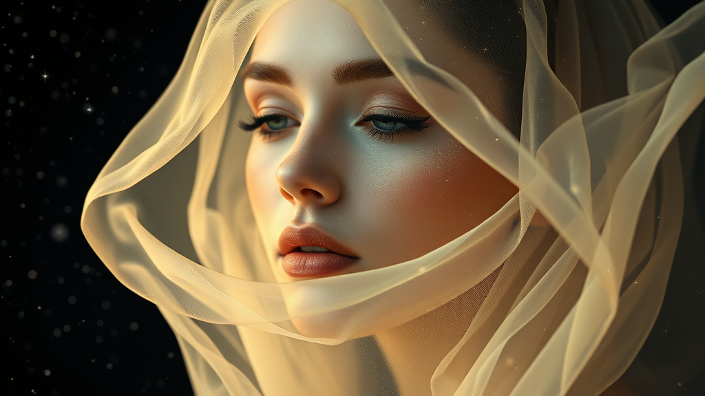 Luminous gossamer veil makeup in shades of opalescent cream against the velvety blackness of stars exploding with stardust, 8k cinematic interpretation of an ethereal dreamscape, lossless texture, soft whispers of surrounding light.