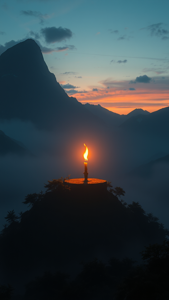 Luminous like a solitary flame in twilight, ethereal dreamscape, hyperrealistic, rendered in octane, crafted by artgerm, intricately detailed illustration, celestial ambiance, digital masterpiece, excessively detailed, conceptual vision, harmonious color palette, featured on artstation, cgstudio, unmatched beauty, breathtaking composition, softly dramatic, intricate subtleties, acclaimed artwork, captivating landscape, unreal engine, 8k resolution, vertical aspect ratio of 1:2.