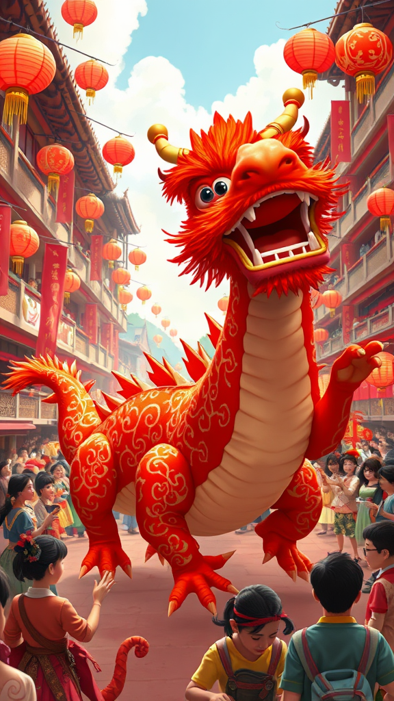 Lunar New Year celebration featuring a vibrant red dragon in the style of Pixar animation, blending traditional Chinese cultural motifs with intricate, ornate costumes. The scene captures the joyful chaos of a festive parade, where Victorian-inspired illustrations dance alongside the dragon, creating a harmonious fusion of styles and eras. The atmosphere is lively and colorful, with a playful, whimsical energy as onlookers join the celebration in cheerful unity.