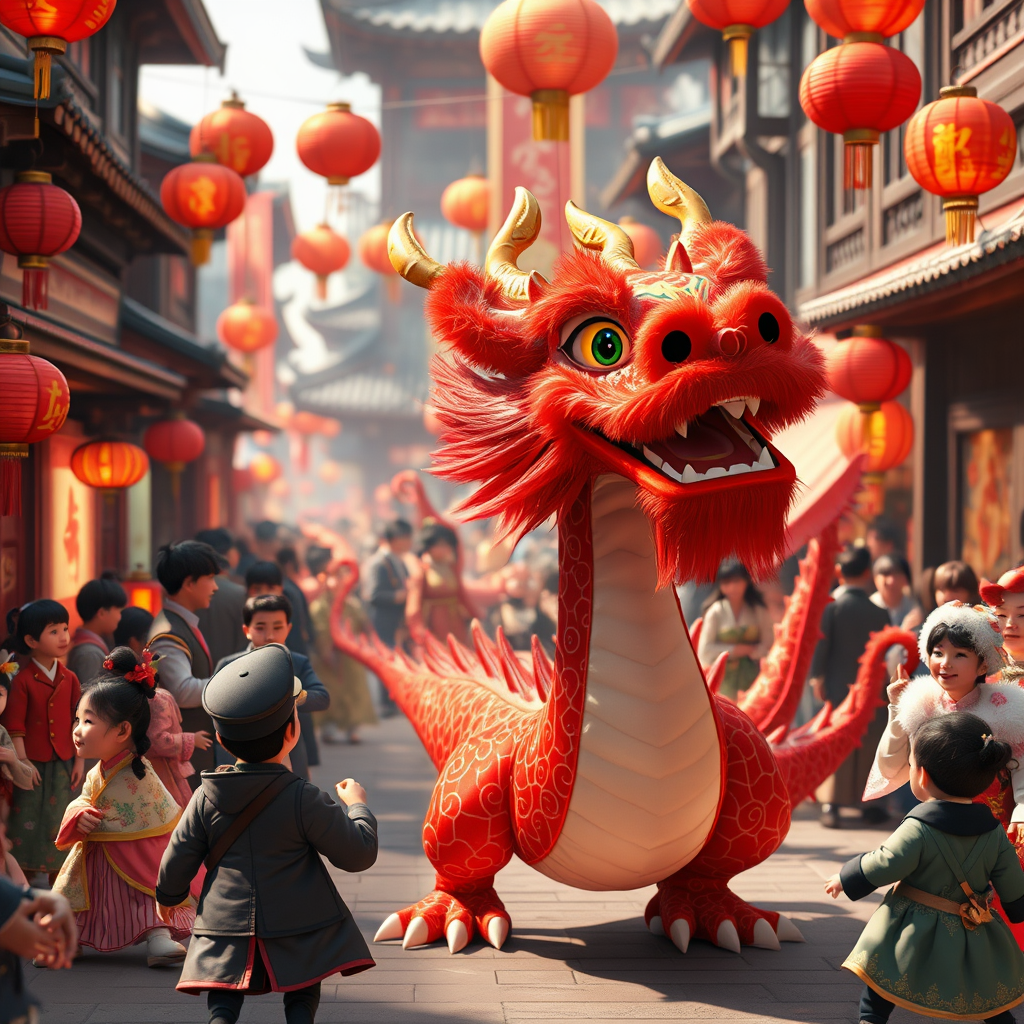 Lunar New Year celebration featuring a vibrant red dragon animated in the whimsical style of Pixar, incorporating traditional Chinese cultural themes. The scene showcases intricate, elaborately designed costumes with subtle Victorian influences, capturing a sense of joyful chaos and festive energy. A harmonious blend of tradition and modernity, with characters joyfully interacting in a bustling street, highlighting the dragon's elegant movements and lively expressions.