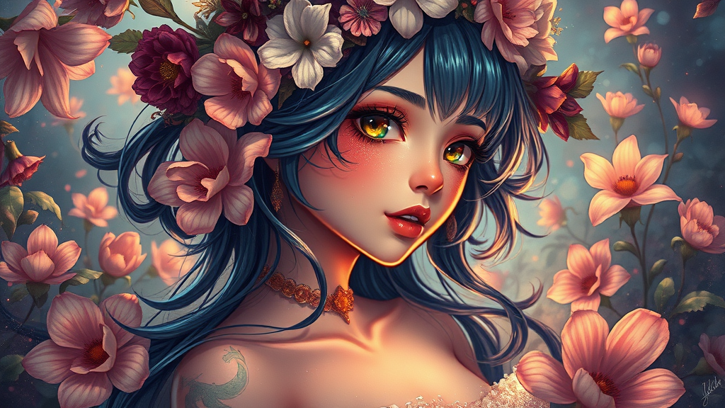 Lush acrylic artwork, stunning anime figure, oil painting style, intense luminescent effects, floral embellishments, dramatic chiaroscuro, divine cinematic rim lighting, baroque art essence, aspect ratio 2:3.