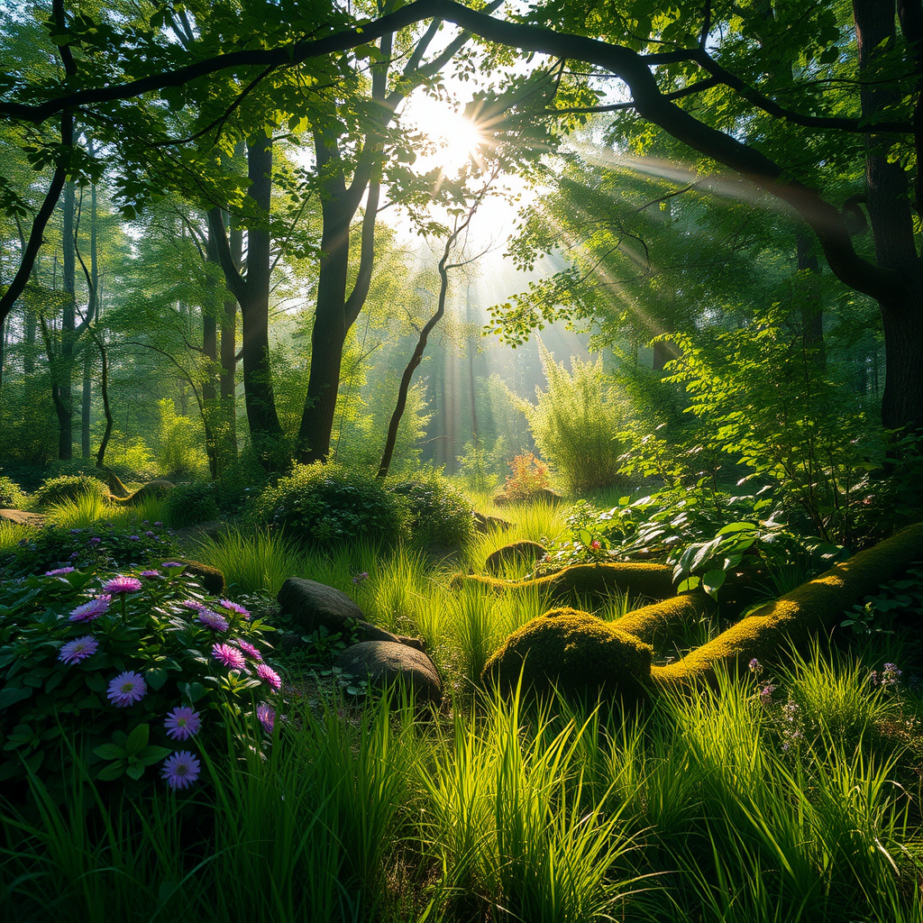 Lush forest scenery during the day, a green theme of fantasy nature with vibrant flowers and diverse foliage, including bushes, moss, and various leaf types. Sunlight filters through the tree canopy, casting light rays and sunbeams onto the soft grass below. Emphasizing an untouched outdoor landscape, the scene embodies serenity and life.
