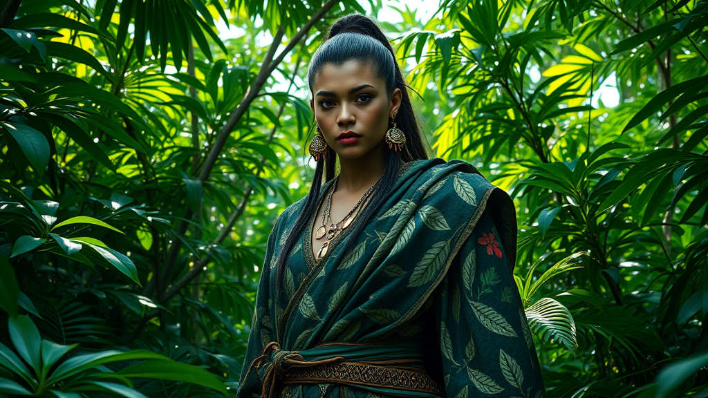 Lush greenery surrounds, cinematic capture in 4k UHD, towering presence amid verdant foliage, draped in attire patterned with leaves and detailed floral motifs, adorned with nature-inspired accessories, dappled sunlight filtering through the canopy, set in a mystical jungle atmosphere, embodying the elegance of a refined warrior with a hint of sensual allure.
