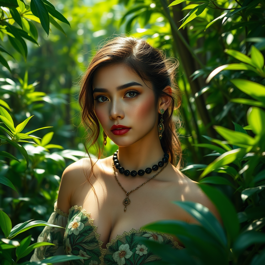 Lush greenery surrounds, cinematic clarity, 4k UHD detail, poised amidst verdant flora, wearing garments adorned with delicate floral patterns, nature-themed jewelry, dappled sunlight streaming through the canopy, immersive jungle atmosphere, refined leaf warrior grace with a subtle hint of allure.