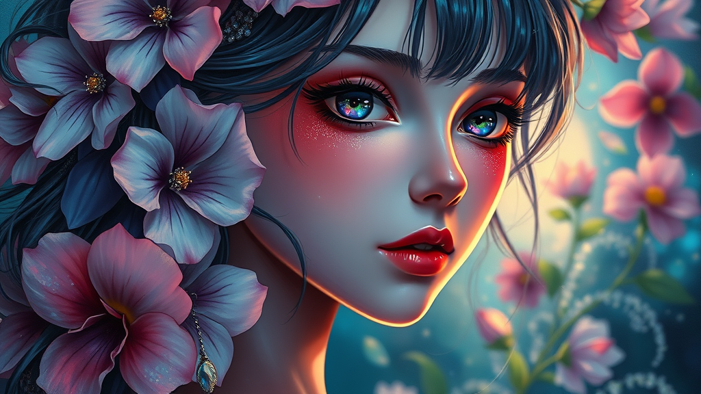 Lush oil painting of an alluring anime girl with vibrant acrylic hues, adorned with intricate flower decorations and shimmering iridescent reflections, dramatic chiaroscuro effects highlighting her features, enveloped in divine cinematic rim lighting, reminiscent of opulent rococo artistry, βar 2:3.