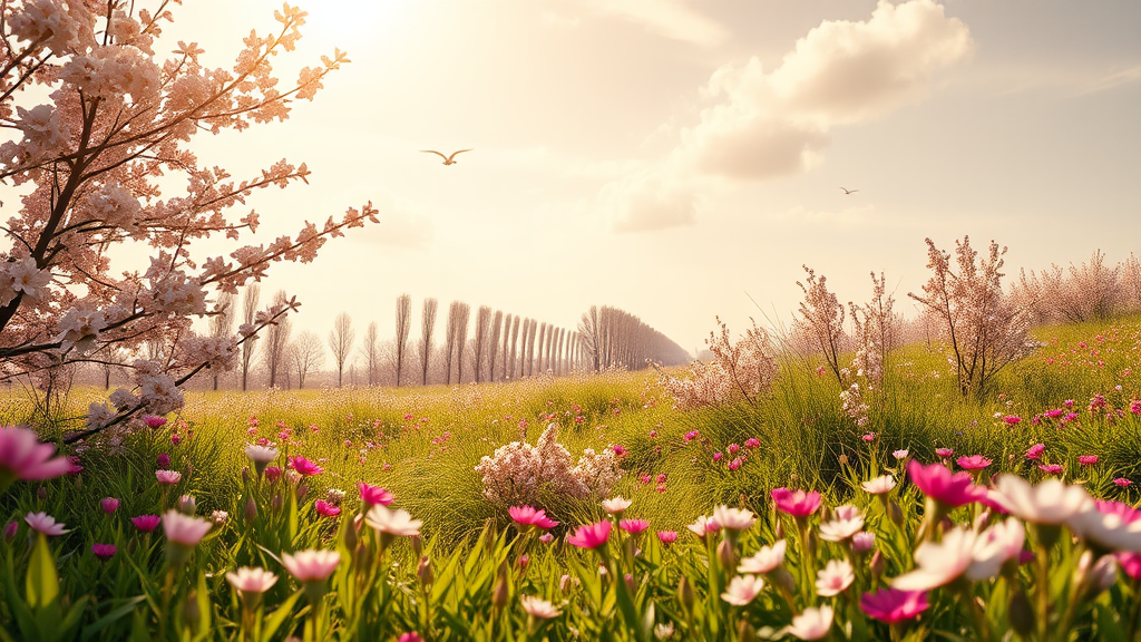 Lush spring meadow, ultra-high definition, meticulously detailed with a touch of realism, rendered in gleaming octane, vibrant blossoms dot the landscape, soft pastel skies with hints of cream and peach hues, sunlit ambience casting delicate shadows, a gentle breeze rustling through the foliage.
