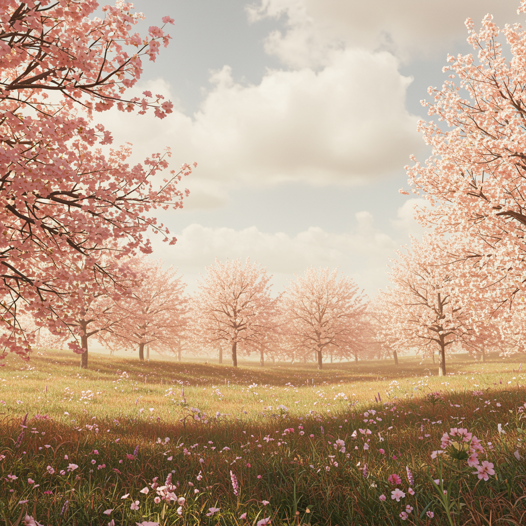 Lush spring scenery, cinematic quality, ultra-high definition, intricately detailed and lifelike, rendered with photorealism, blooming flowers in pastel shades, expansive skies with soft clouds, warm and inviting cream tones.