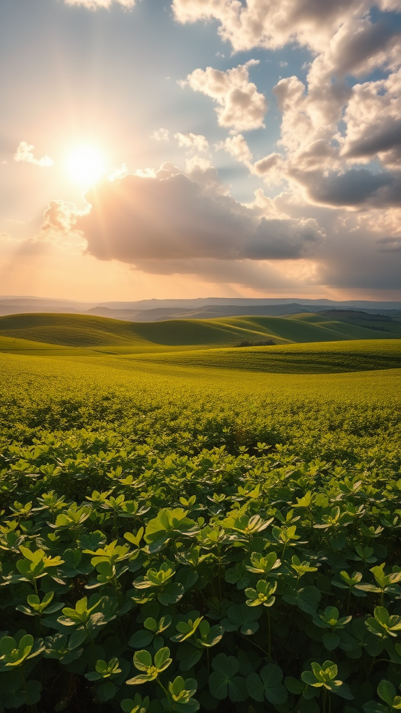 "Lush, verdant landscape under a vibrant sky, expansive fields of clover stretching to the horizon, the sunlight casting a warm glow over the scene, gentle rolling hills in the background, creating a serene and tranquil atmosphere, the essence of chance and fortune woven into the environment, vivid colors and soft shadows adding depth and richness to the idyllic view."