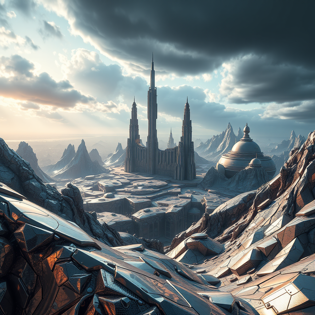 Lustrous metallic landscape with shimmering reflections, intricate details, and a futuristic vibe, featuring towering structures and sleek surfaces under a mysterious sky with glimmers of light, capturing a sense of awe and innovation in a vertical composition.