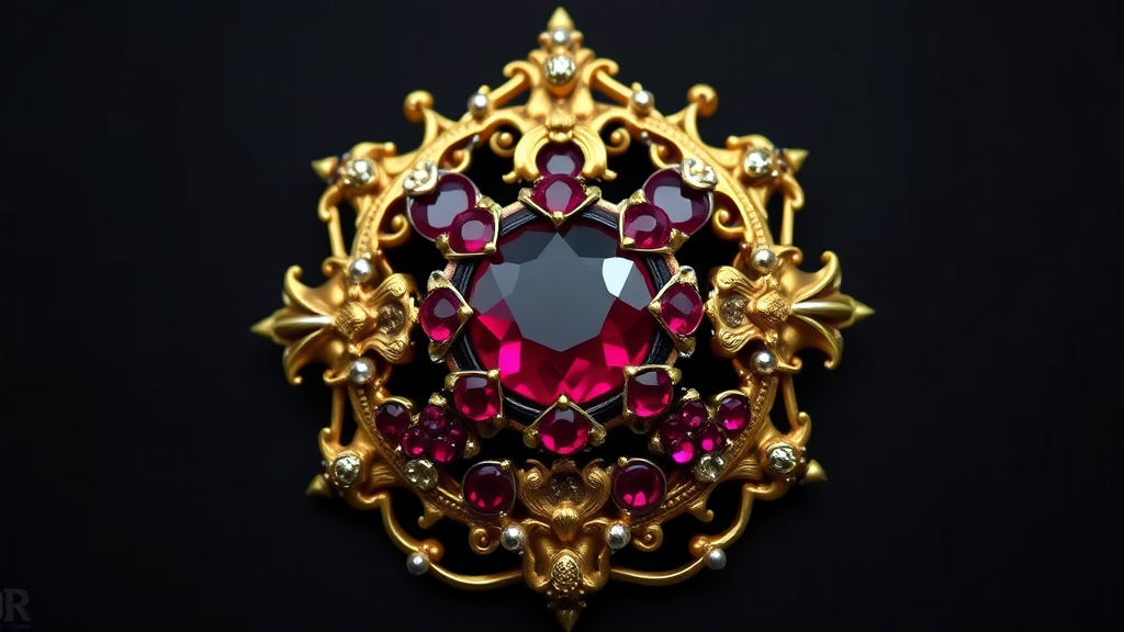 Lustrous Ruby Crest, a powerful game artifact, radiates with gold filigree and intricate silver embellishments, exuding the mystique of dark fantasy; meticulously crafted in a perfect circle, this enchanting brooch commands attention and awe.