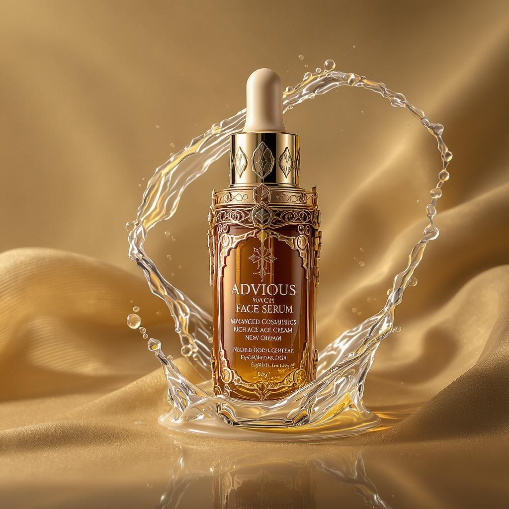 Luxurious face serum, advanced cosmetics, rich face cream, intricately detailed, steampunk aesthetic, ultra-realistic rendering, professional studio lighting, nourishing face serum, superior cosmetics, indulgent face cream, water elements, submerged cream, high-end beauty emporium, premium body care, expert hair care solutions, radiant hair, stunning tresses, golden highlights, captivating allure, opulent beauty experience.