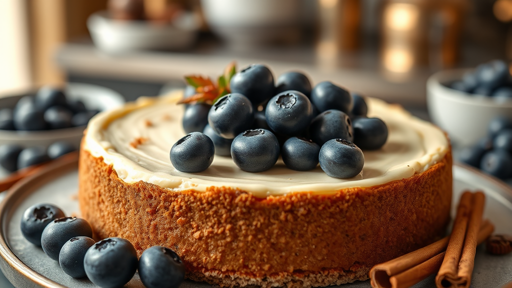 Luxurious food photography featuring a decadent cheesecake adorned with plump blueberries and a hint of cinnamon, styled in an opulent Michelin-star kitchen. The composition boasts an ultra-detailed depth of field, with soft uplighting accentuating the cake's creamy texture and the natural vibrancy of the blueberries, creating an exquisite visual feast.
