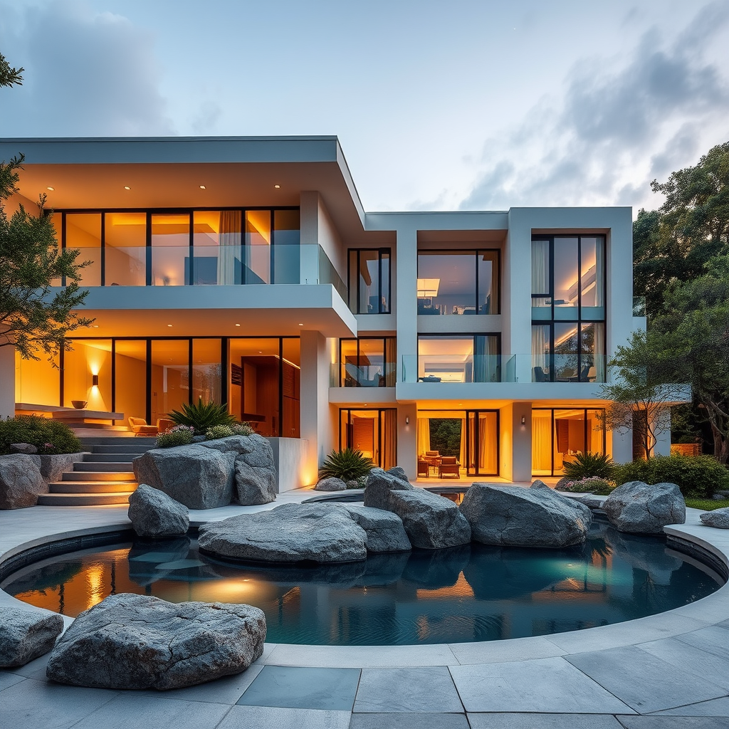 Luxury modern and classic architecture design house, high-resolution photography capturing sleek lines and elegant details, featuring a serene pool surrounded by natural rocks, lush landscaping accentuating the harmonious blend of contemporary and timeless elements, warm ambient lighting highlighting the architectural textures and sophisticated materials, creating a tranquil yet opulent atmosphere.