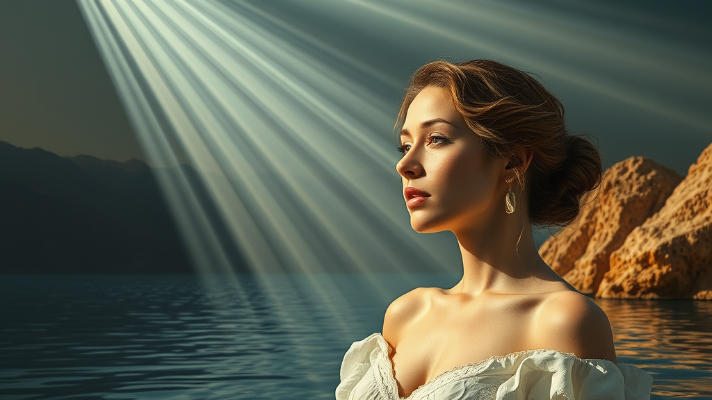 Luzerne fashion illuminated by rays of light crafted by Sebastian Rossetti, capturing the essence of Yigal Ozeri's hyper-realistic style and the sculptural depth of Ursula von Rydingsvard. A serene scene unfolds over calm waters, featuring a white woman inspired by the landscapes of Emek Golan. The composition is enriched with terracotta hues, embodying natural warmth and texture, all rendered in hyper-realistic detail to emphasize the raw beauty of the environment and subject.