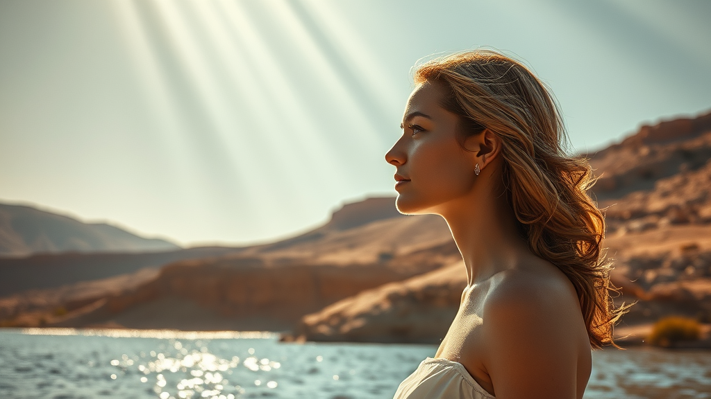 Luzerne fashion illuminated by streams of light, captured in the essence of a Yigal Ozeri masterpiece with influences of Ursula von Rydingsvard's sculptural grandeur. Envision a serene landscape of calm waters, featuring a white woman set against the backdrop of Emek Golan, infused with earthy terracotta hues. The composition is rendered in hyper-realistic detail, emphasizing the interplay of light and texture, portrayed in a raw, unfiltered style.