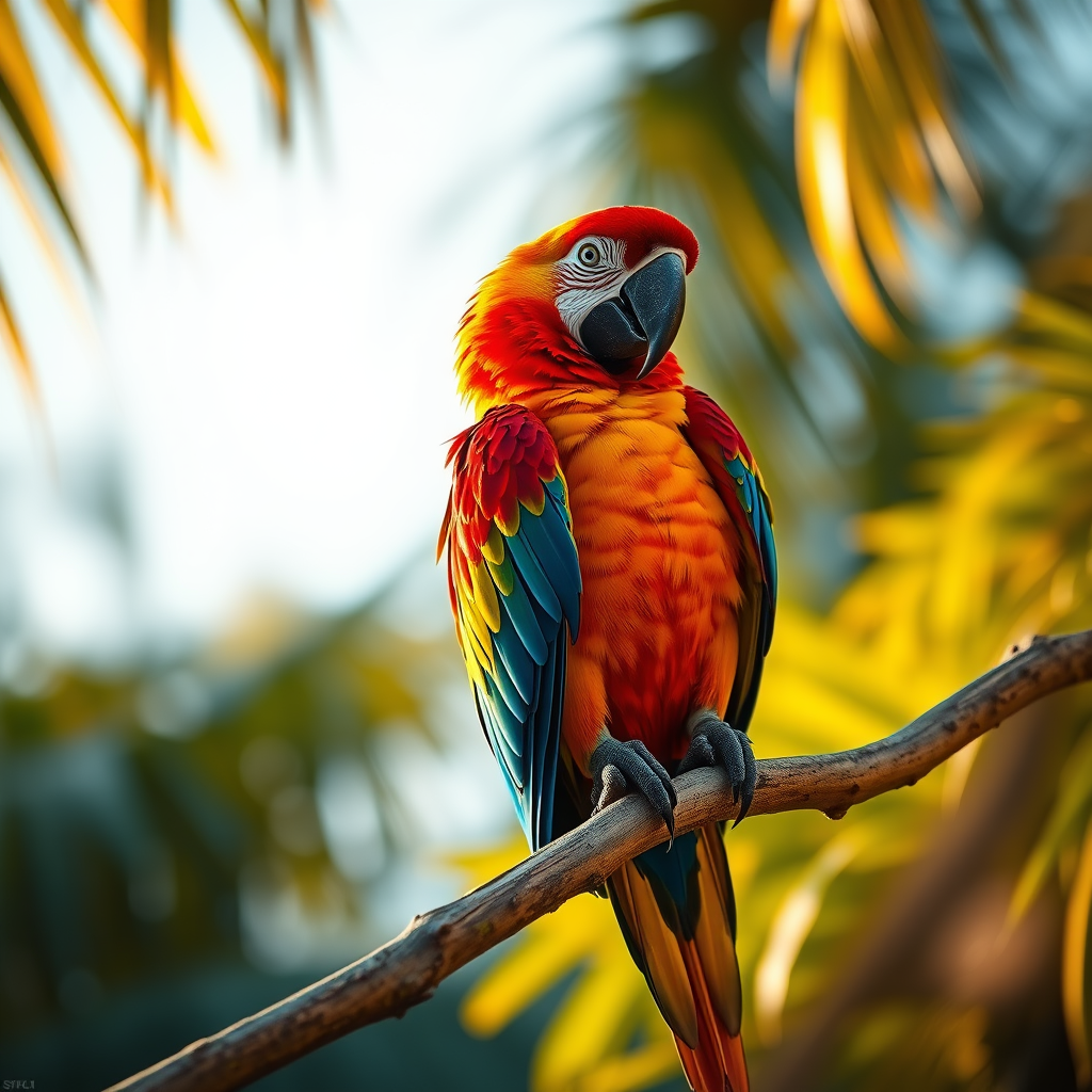 Macaw perched on a vibrant Caribbean tree branch, bathed in golden natural light, expertly enhanced with post processing and vivid color grading, capturing the essence of wildlife photography in high definition. Photorealistic image with intricate details, shot in stunning 8k resolution, showcasing a shallow depth of field for a striking focus on the macaw, aspect ratio 9:16.