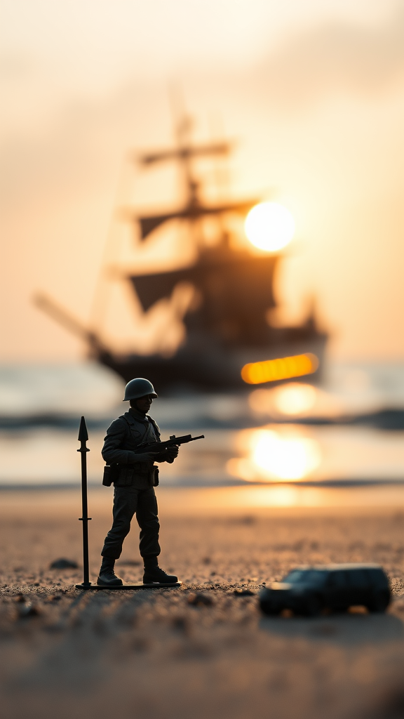 macro lens captures a toy soldier figurine poised on the beach, with the silhouette of a warship ablaze and descending into the sea, bathed in gentle light, emphasizing tension and scale