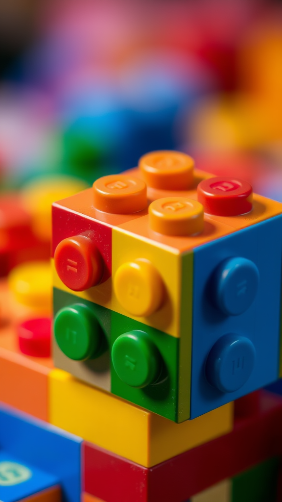 Macro photograph of a single Lego brick, showcasing vibrant and artistic color variations, captured with a GF32-64mm f/4 lens under professional studio lighting for enhanced detail and texture.
