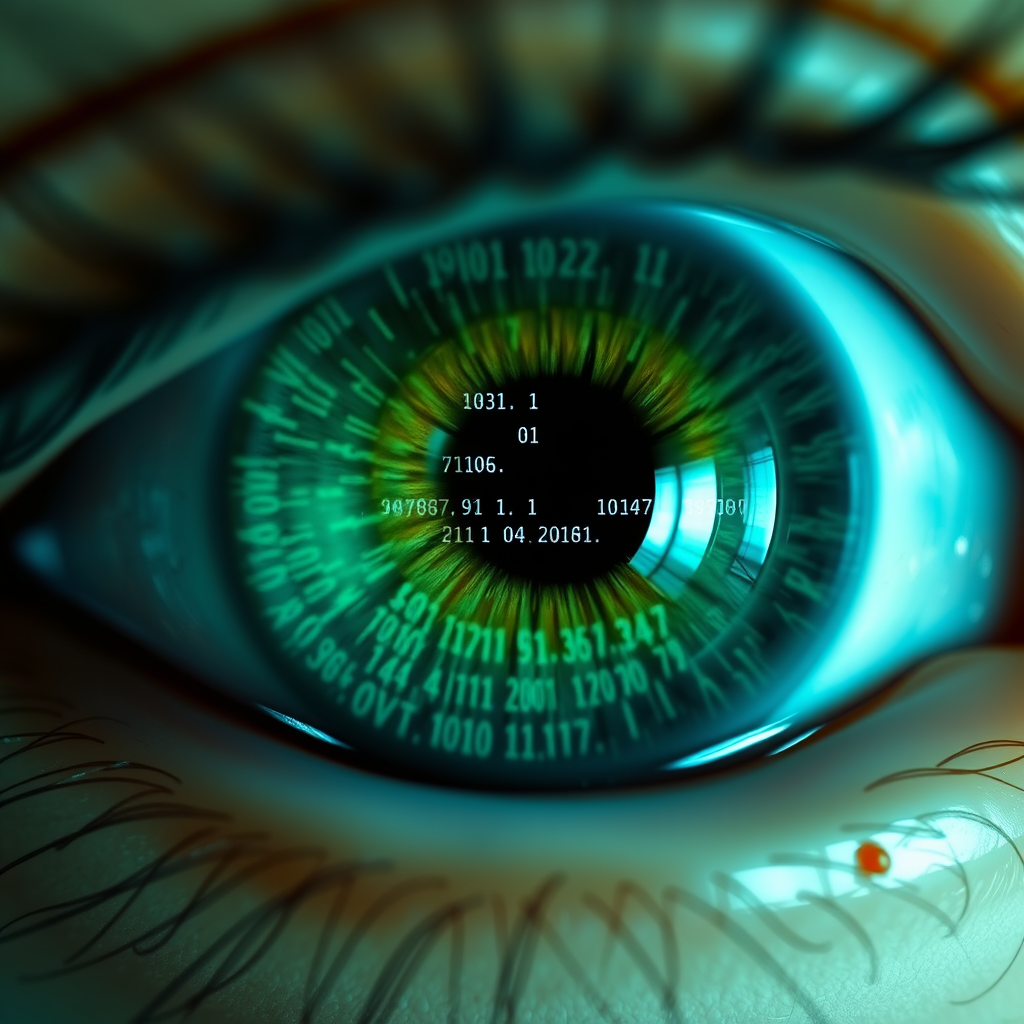 Macro shot capturing an intricately detailed green eye, reminiscent of a cinematic film still, with the pupil reflecting a vibrant scene of flickering computer code in blues and whites.