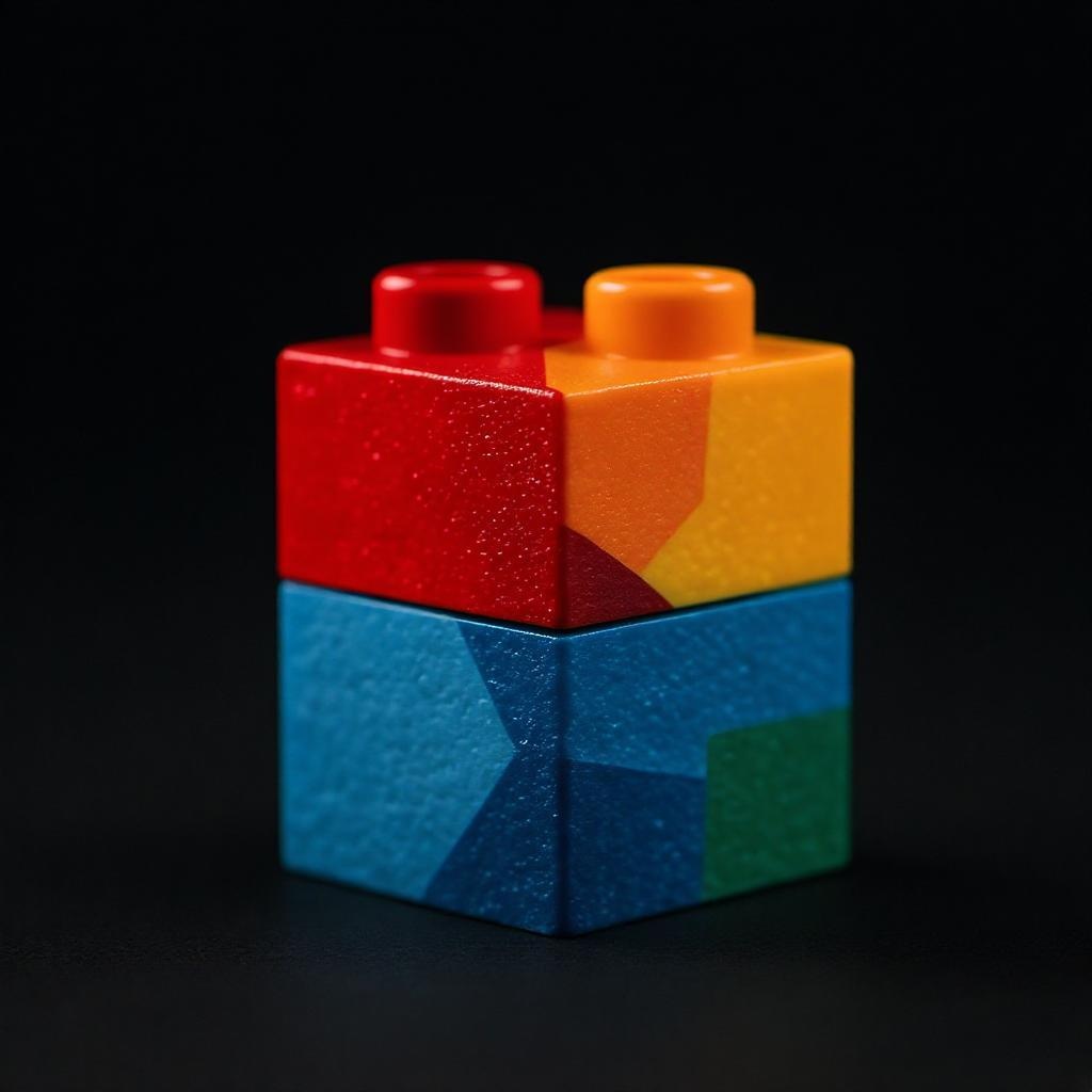 Macro shot of a single Lego piece showcasing artistic color variations, captured with a GF45-100mm f/4 lens under professional studio lighting, highlighting intricate details and textures in a vibrant and refined composition.