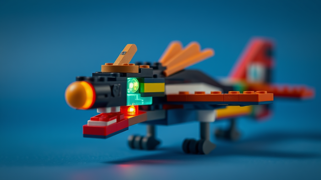 Macro still life of a vintage toy plane as a makeshift dragon head, composed of interlocking Lego bricks, set against a gradient blue background created with multicolor flashing studio lights on the GF32-64mm f/4 lens, but this time it's night mode where every other brick is softly out of focus, the dragon's eyes glow with a warm LED light illuminating its icy gaze like a secret moon