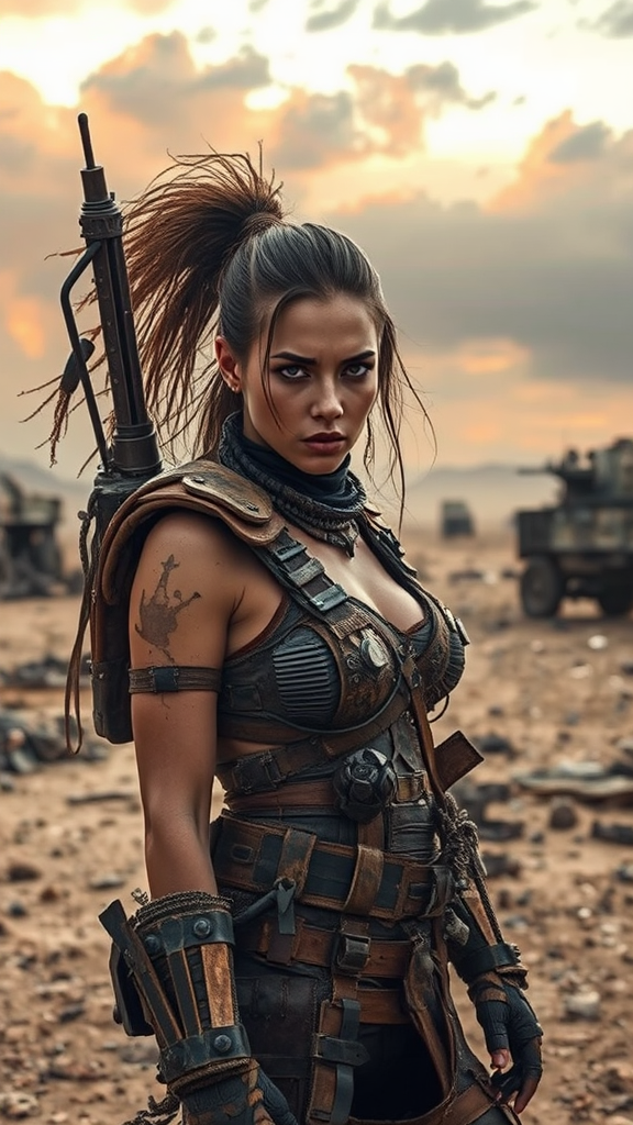 Mad Max-inspired female warrior in a barren post-apocalyptic landscape, donned in rugged, improvised armor made from scavenged materials, her face determined and fierce, surrounded by dilapidated remnants of a lost civilization, a hauntingly beautiful sky in muted tones overhead, vehicles of war in the background hinting at past battles, atmosphere gritty and raw, showcasing both strength and resilience, elements of dystopian future subtly incorporated throughout, the scene capturing both the harshness and haunting allure of a world reborn from chaos.