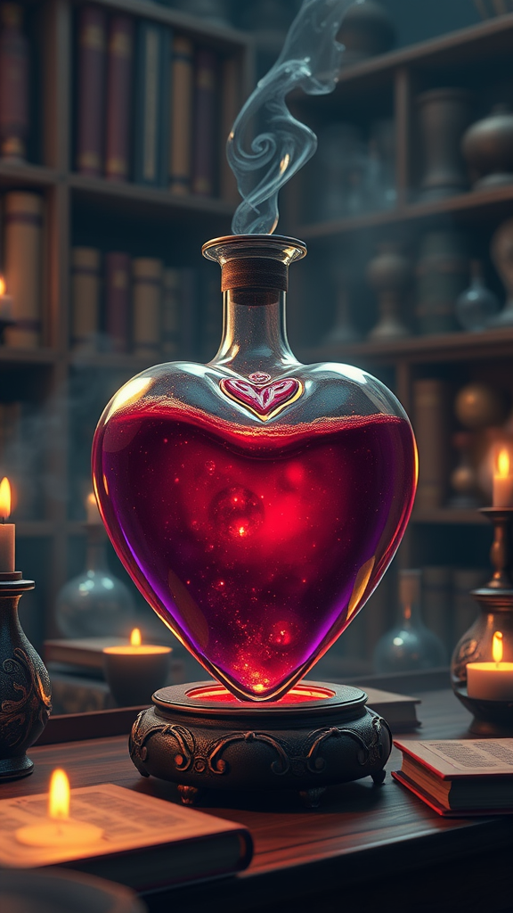 Magic elixir in a heart-shaped flask, ancient apothecary setting, fantasy video game asset, artstation showcase, enchanting aura, expertly crafted in cinema4d, rendered with octane for stunning clarity, 8k resolution, cinematic quality, rich in intricate details reminiscent of Studio Ghibli, soft luminescent glow, shelves lined with mystical artifacts, warm ambiance, hints of swirling magical particles emanating from the flask, delicate engravings on the glass, surrounded by aged tomes and glistening potions.