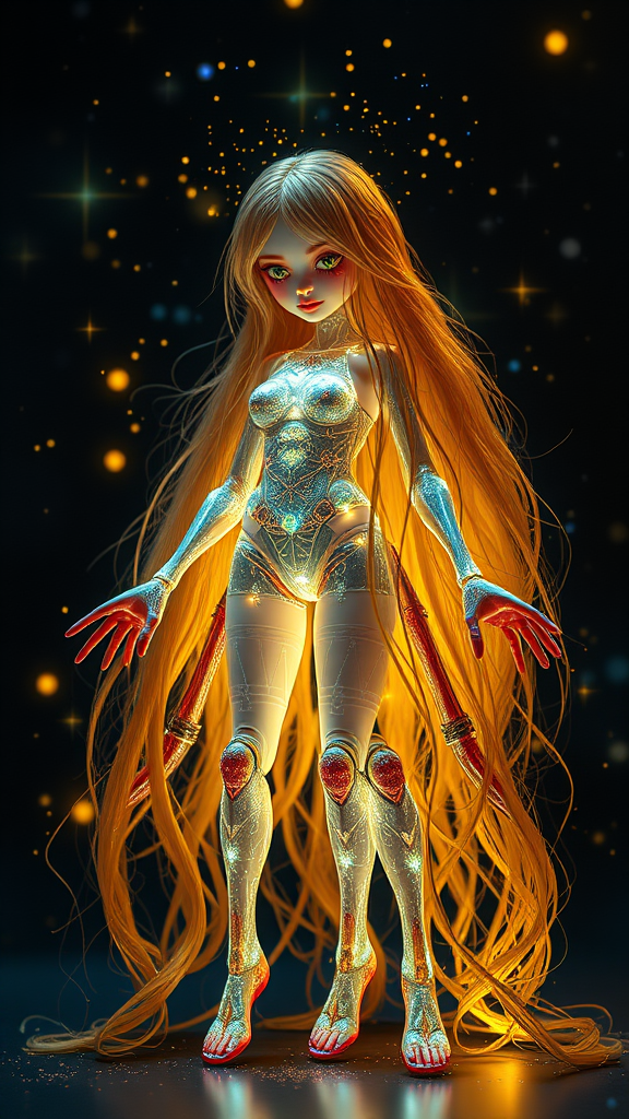 Magical girl with cascading golden hair, surrounded by a vibrant aura of sparkles, glowing with bioluminescence in an 8k resolution. Her form is both intriguing and unsettling, featuring multiple limbs with surreal proportions that defy conventional anatomy. She exhibits extra legs and arms, adding to the bizarre allure of her presence. Her hands and feet possess an unconventional and asymmetric design, contributing to a unique, disfigured appearance. Rendered with a 3D octane effect, her figure showcases bad anatomy in a captivatingly distorted way, with blurry and mutated features blending into an out-of-frame composition. Her doll-like features appear erratically tiled, enhancing the notion of a dreamlike, deformed reality.