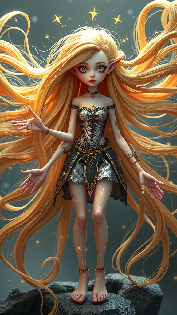 Magical girl with flowing golden hair, exuding a vibrant sparkle and bioluminescent glow, set in an 8k fantasy realm. She possesses unconventional features with extra limbs and exaggerated proportions, creating an otherworldly appearance. Her figure showcases whimsical distortions and intriguing imperfections, like awkwardly drawn hands and feet that add character. The environment is a blend of surreal and abstract elements, with a touch of 3D art reminiscent of a doll-like render, enhancing the magical and mystical atmosphere. Despite irregular anatomy and whimsical mutations, the scene captures a unique blend of beauty and otherworldliness.