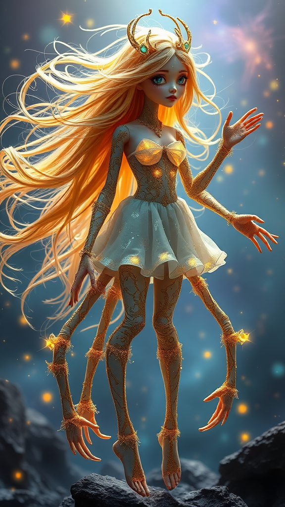 Magical girl with flowing golden long hair and vibrant sparkle effects, set against a backdrop of enchanting bioluminescence. Her form is surreal with extra limbs and unique proportions, creating a fantastical appearance. She has a variety of extra legs and arms, with an intentionally distorted and whimsical anatomy. Exaggerated features are emphasized like a dreamlike doll rendered in high detail. Amidst this, hands and feet are portrayed in a creatively abstract and unconventional style. This magical figure exists in a world that is both enchanting and intriguingly mutated, presenting a canvas of artistic fantasy where the boundaries of typical anatomy are freely explored.