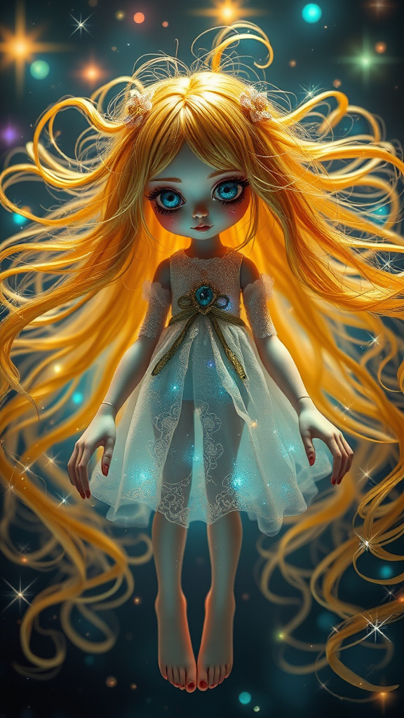 Magical girl with golden, flowing hair surrounded by dazzling sparkles, featuring vibrant colors and hints of bioluminescence. The scene captures a surreal charm with unexpected elements such as extra limbs and unique proportions, creating an otherworldly appearance. The hands and feet appear whimsically rendered, adding a playful, artistic touch. The composition blends fantasy and reality, where the character's form plays with perspectives and dimensions, resembling a doll-like figure with a dreamlike, uncanny presence. The artistic portrayal leans into a stylized aesthetic, with a focus on imaginative and bold expressions.