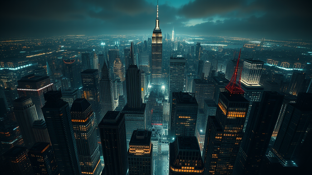 "Majestic aerial view of Gotham City at night, cinematic 32k resolution, high-definition detail, ethereal night lighting casting dramatic shadows, intricate accent and translucent luminescence throughout the skyline, post-production enhancements highlighting architectural elegance, ornate and hyper-realistic detailing, exquisite hypermaximalist design with unparalleled realism, super intricate with expansive panoramic view, vertical 9:16 aspect ratio."