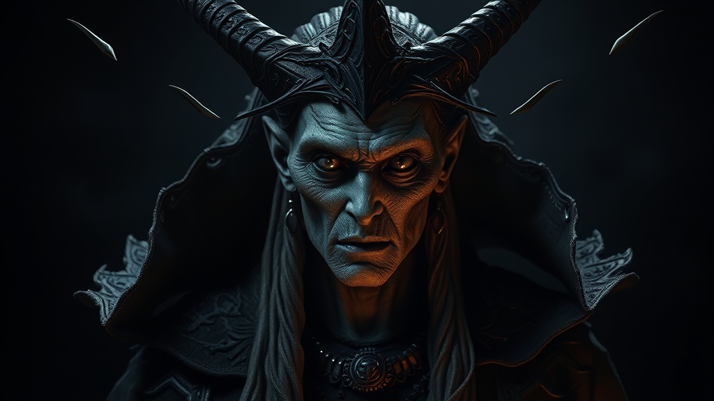 Majestic ancient Strigoi vampire matriarch, embodying horror and enigma, with each feature etched in ultra-detail. Her presence commands respect, shrouded in atmospheric HDR lighting that casts dramatic shadows against a darkened backdrop. Her eyes brim with centuries of wisdom and terror, and her regal posture suggests an air of superior authority. The environment around her is imbued with an eerie sense of foreboding, intensifying her mysterious allure.