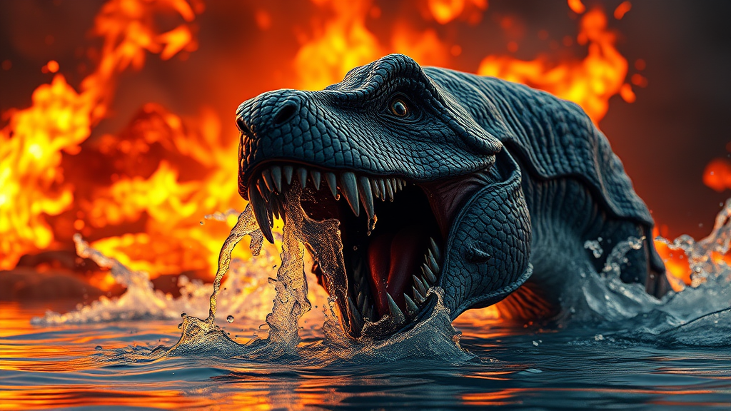 Majestic and intimidating saber-tooth crafted from cascading water, set against a blazing fiery backdrop, with hyper-detailed and vivid contrasting colors. The scene is captured in 4K resolution during the golden hour, highlighting sharp focus and lifelike features. The image employs advanced rendering techniques as seen in Octane Render and Unreal Engine 5, featuring stunning volumetric lighting, photorealistic elements, and an elegant fusion of elemental forces.