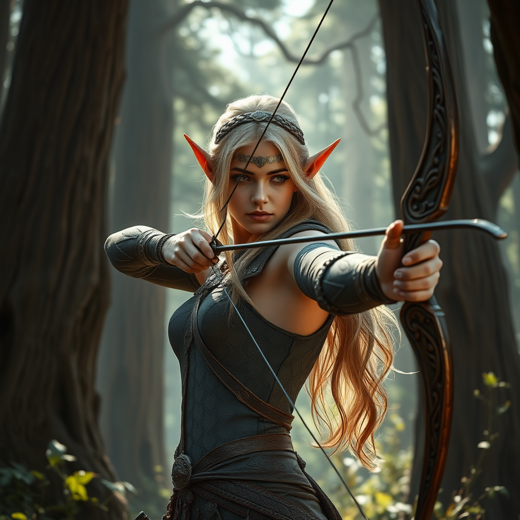 Majestic and intricately detailed elf woman archer poised in a mystical woodland setting, reminiscent of a high-fantasy RPG world like Dungeons & Dragons. Her elegantly carved longbow is adorned with ethereal patterns, and her attire is woven with delicate leaf motifs. The atmosphere is captured in dramatic, cinematic lighting, enhancing the photorealism of the scene. The 8k resolution reveals every nuance, from the play of shadows across her flawless skin to the shimmering highlights in her flowing hair. Her keen eyes lock onto a distant target, embodying grace and focus amidst the towering, ancient trees that form a breathtaking backdrop.