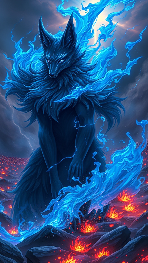 Majestic and powerful dark fox exuding deep blue flames of energy, depicted as an anime-inspired sorcerer humanoid male prince of darkness, dominating a chaotic battlefield. He stands amidst a backdrop of swirling blue infernal flames and vibrant sparks. The scene unfolds during an apocalypse, filled with an array of vivid colors. This digital illustration is both intricate and elegant, capturing a scenic and hyper-detailed moment in 8k resolution, with an intense thunderstorm resonating through the atmosphere.