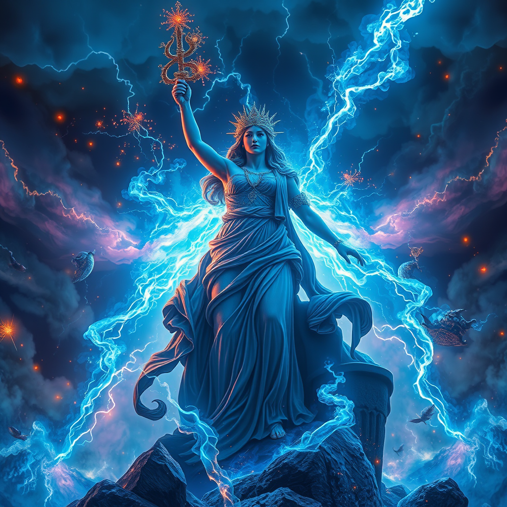 Majestic and powerful depiction of dark blue infernal energy flames, goddess Athena commanding an apocalyptic scene with elegant grace, surrounded by vivid and colorful sparks. The backdrop is a hyper-detailed, scenic thunderstorm, capturing the essence of both chaos and beauty. This stunning digital illustration embodies intricate artistry, with every element rendered in crystal-clear 8K resolution, presenting a surreal and captivating visual display.