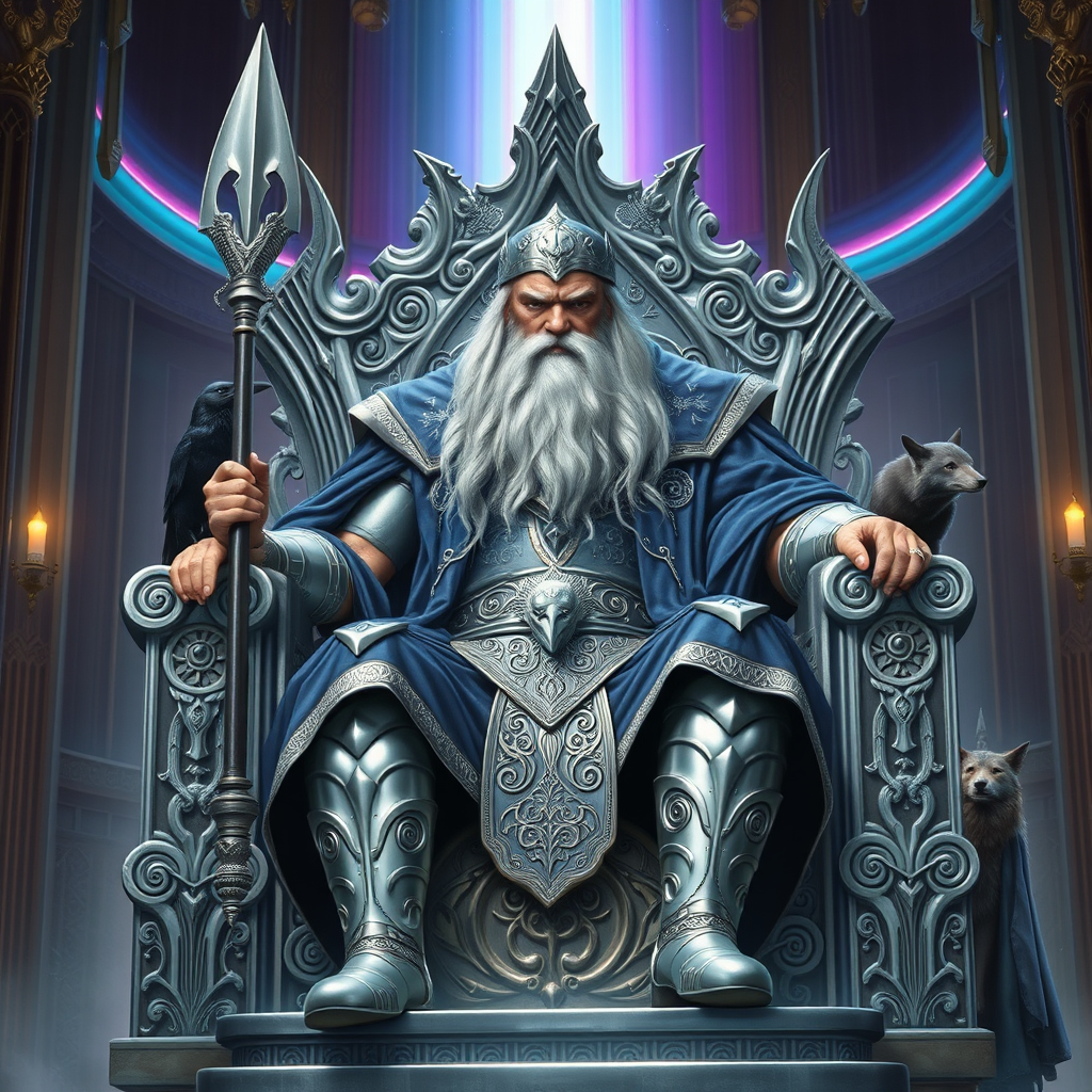 Majestic and regal, Odin, the Allfather of Norse mythology, sits upon his towering silver throne in the grand hall of Asgard. His intense, one-eyed gaze conveys both wisdom and power, while his long, silver beard cascades like a waterfall of light. Dressed in ornate silver armor and a deep indigo cloak embellished with runic symbols, he grips the legendary spear Gungnir. The intricately carved throne bears ancient designs that softly glow with the energy of the Nine Realms. Ravens Huginn and Muninn perch attentively on the armrests, while wolves Geri and Freki sit vigilantly by his side. The ethereal glow of the Bifrost streams in the background, casting a spectrum of radiant hues across the hall, suffusing the air with a sense of divine authority and mystery.