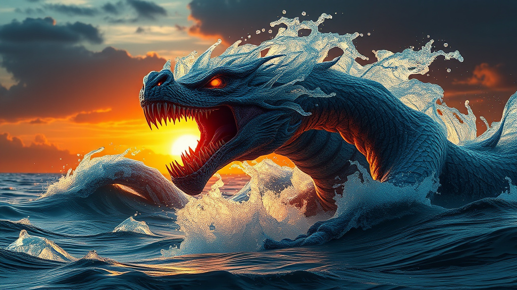 Majestic and terrifying saber-toothed creature forged from swirling water, set against a fiery backdrop, immensely detailed with striking contrasts and vivid hues, captured in stunning 4K during golden hour, with immaculate sharpness and rendered using Octane Render and Unreal Engine 5, featuring ethereal volumetric lighting for an unparalleled photorealistic and graceful elemental masterpiece.