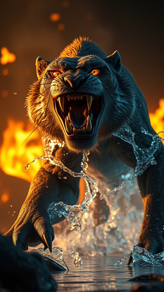 Majestic and terrifying sabertooth imbued with water essence, set against a blazing fire backdrop, hyperdetailed with an intense photorealistic quality. The scene showcases contrasting and vibrant colors illuminated by the golden hour glow. Rendered in 4K with sharp focus using Octane Render and Unreal Engine 5, emphasizing volumetric lighting for a dynamic and ethereal atmosphere. The sabertooth embodies elemental elegance, with water flowing seamlessly around its fierce form, creating a stunning interplay of light and shadow.