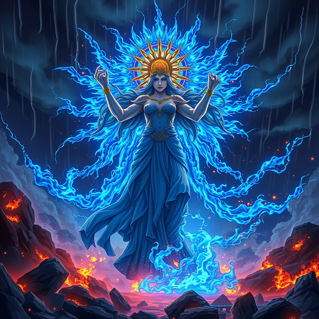 Majestic anime scene depicting a formidable goddess Athena engulfed in radiant dark blue flames of energy, casting a mesmerizing glow with infernal sparks illuminating the apocalyptic backdrop. The scenery is vibrant and intricately elegant, showcasing a digital illustration with hyper-detailed precision. Amidst a thunderstorm, the scene is captured in stunning 8K resolution, highlighting the colorful, scenic power and overwhelming presence of this divine being amidst celestial chaos.