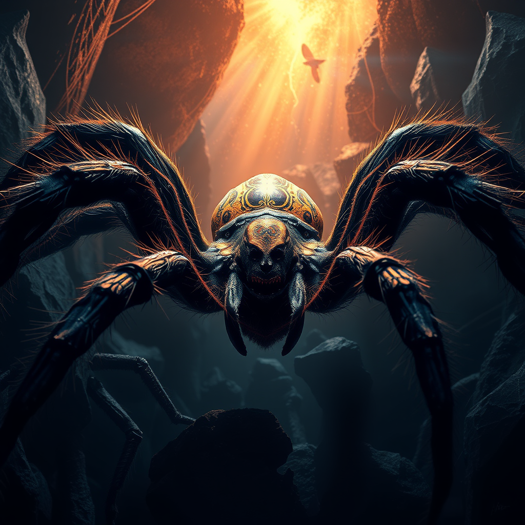 **Majestic Arachnid Realm by [[[**, , ))), , , ultra-realistic, hdr, shadowy hues, , , breathtaking visual artistry, mythical, , intense illumination, intricately crafted, beyond boundaries, label, script, insignia.