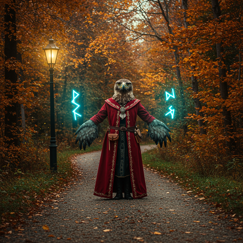 Majestic autumn forest, eagle hunter, winding gravel path, red elaborately adorned robe, humanoid figure, blue-green neon runes pulsating with light, low-angle perspective, intricately detailed eagle visage, piercing luminous eyes, ultra-realistic photographic style, subtle reflections, antique lamp post, animated and dynamic posture, dancing fireflies, hybrid eagle-human form with unique charm, intriguing proportions, expressive human features, gracefully fused fingers, soft muted colors, endearing presence.