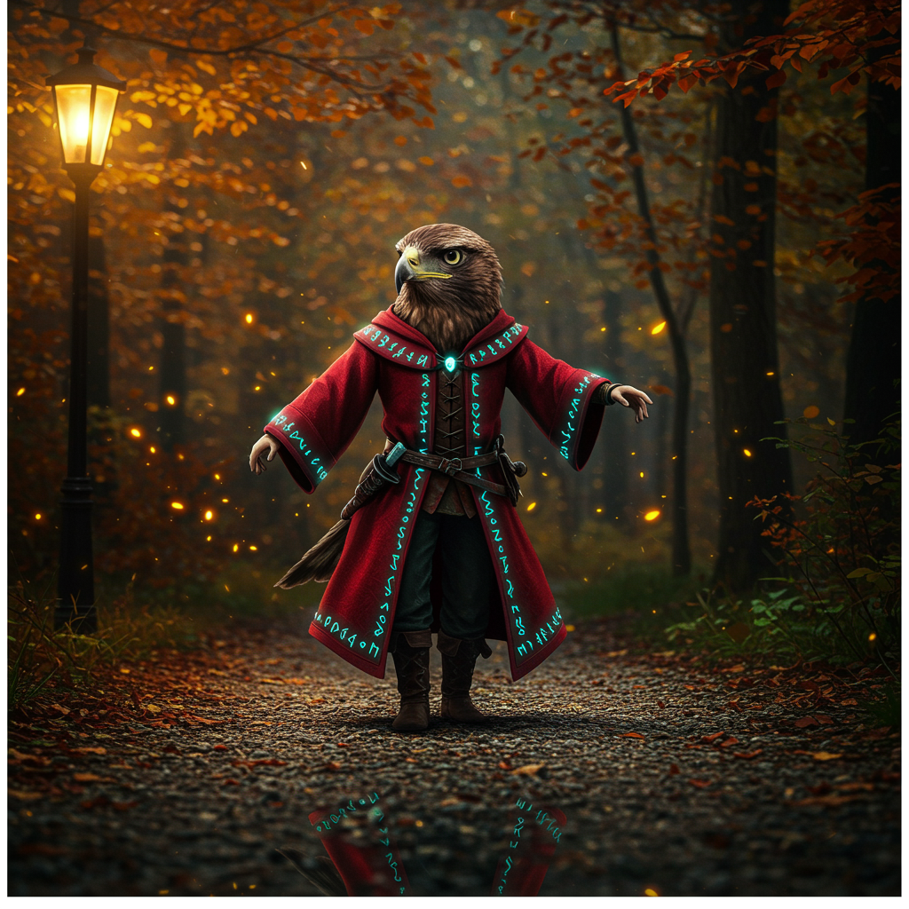 Majestic autumn forest, eagle hunter with a gravel path underfoot, adorned in a red intricately designed robe, humanoid form with vibrant blue-green glowing runes etched across the fabric, capturing an intense low-angle perspective. The eagle's head is highly detailed with piercing glowing eyes, as if taken from a realistic photograph. Reflections dance around, caught in the light of an antiquated lamp post. In a dynamic action pose, fireflies illuminate the scene, swirling around a unique hybrid of eagle and human. Despite the chaotic inspiration, the composition is unexpectedly harmonious, with slightly altered human proportions lending an endearing, whimsical quality. The muted colors enhance the scene's inviting warmth, and though the fusion of human and eagle is unusual, the figure is ultimately cute and amicable, showcasing a gentle fusion of elements that is imaginative and captivating.