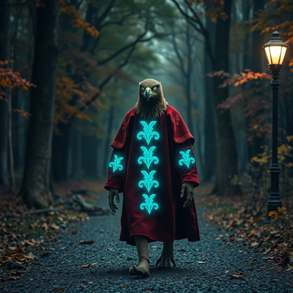Majestic autumn forest scene with an eagle hunter in an intricately patterned red robe walking on a gravel path. The humanoid figure exhibits glowing blue-green neon runes across its body. A breathtaking, low-angle shot captures the highly detailed features of the eagle’s head, its glowing eyes exuding intensity. This realistic photograph showcases reflections and a nearby lamp post casting a gentle glow. The hunter strikes a dynamic pose, surrounded by the soft, ambient light of fireflies. The character, despite its hybrid eagle-human appearance, retains a uniquely charming aspect with gentle human features, slightly odd proportions, and fused fingers adding an endearing quality. The muted color palette enhances the magical, otherworldly atmosphere, combining elements of the strange and the delightful in this captivating scene.