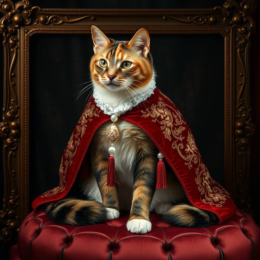 Majestic calico cat, resplendent in intricately embroidered velvet cloak with crimson trim, posed on a richly upholstered ottoman amidst a dark, velvety backdrop, framed by an ornate gilded frame, showcasing delicate, hand-beaded lace trim, elaborate pearl-encrusted jewelry, and a tasseled, fur-lined cloak pin, evoking a whimsical sense of historic nobility, regal bearing, and sleek, velvety fur.