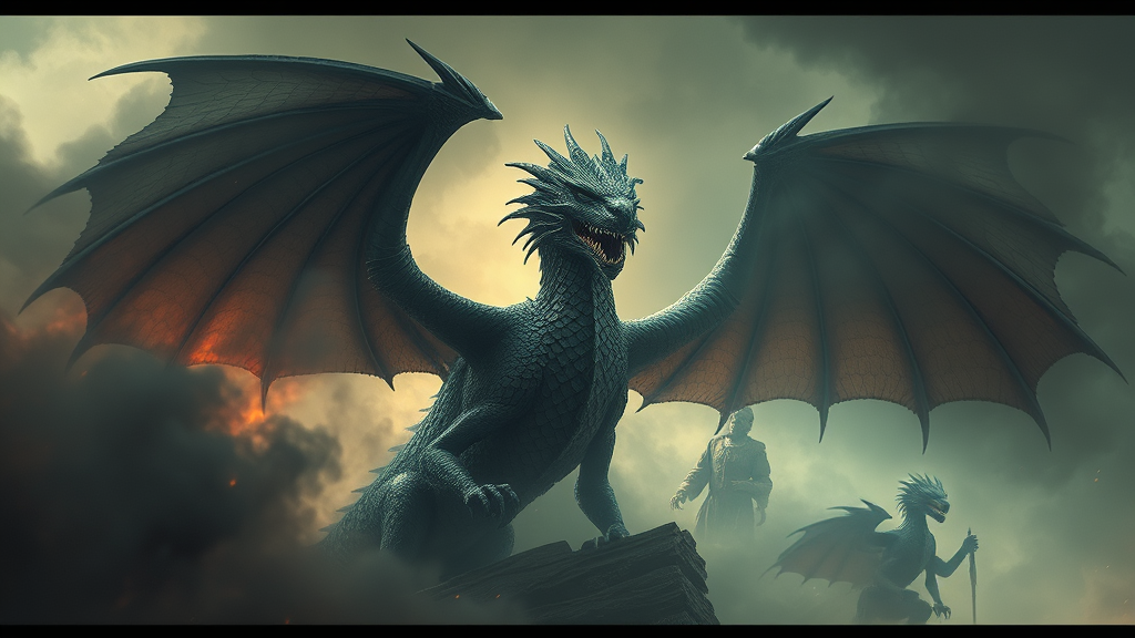 Majestic, colossal dragon with intricate scale wings, enveloped in swirling smoke and dark fog, reminiscent of Magic: The Gathering, inspired by the styles of Andrei Riabovitchev, Massimo Caggese, and Peter Mohrbacher. The scene is imbued with an ominous, intricate atmosphere, rendered in high octane and moebius style with influences of Arney Freytag's photography. The dragon strikes a stunning pose amidst a composition that exudes ArtStation perfection, highlighted by dramatic lighting and deep shadows, complemented by orthodox symbolism. This piece captures concept art in its truest form, blending elements of ambient magic realism. The scene is set in an 8k resolution, exhibiting a hyper-maximalist, overly-detailed cinematic aesthetic combined with tribal dark fantasy themes.