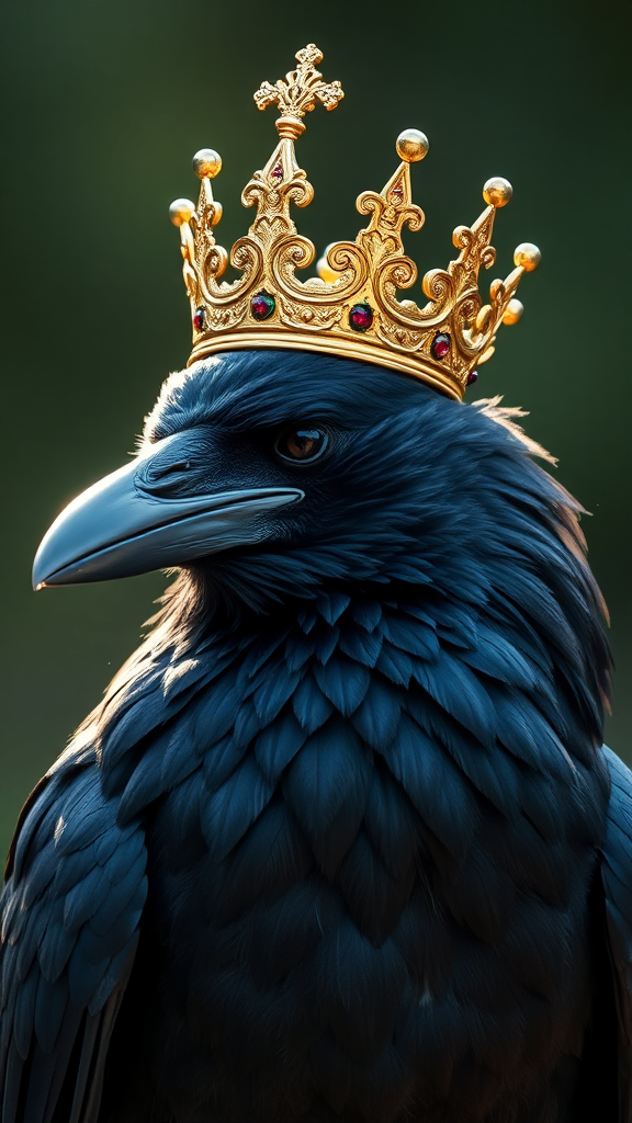 Majestic crow, adorned with a striking crown, perched gracefully as sunlight glimmers on its regal head, imbued with an aura of effortless elegance and deep allure.